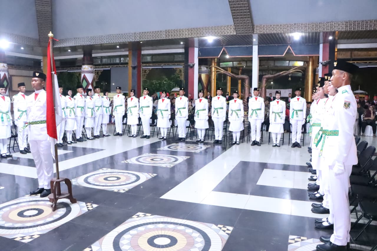 Lampung Tengah – Suasana khidmat menyelimuti Gedung Sesat Agung Nuwo Balak, Gunung Sugih, saat Bupati Lampung Tengah, H. Ardito Wijaya, resmi melantik Pasukan Pengibar Bendera Pusaka (Paskibraka) Kabupaten Lampung Tengah Tahun 2025 pada Jumat malam (15/08/2025). Para anggota Paskibraka yang akan bertugas pada upacara HUT ke-80 Kemerdekaan RI tersebut dikukuhkan melalui prosesi sakral yang menjadi momen penting bagi putra-putri terbaik daerah.
