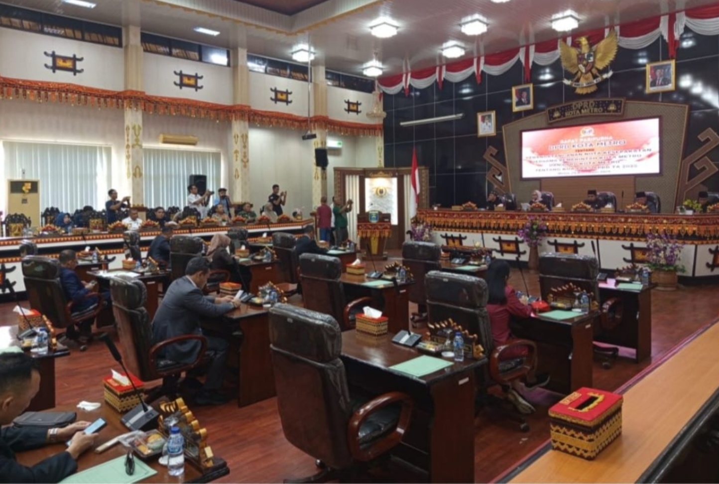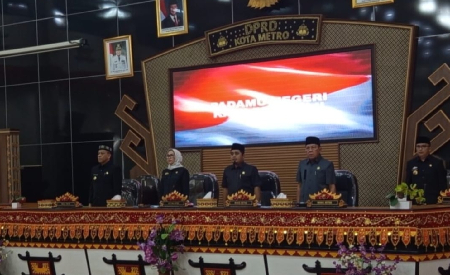 Kota Metro – Dewan Perwakilan Rakyat Daerah (DPRD) Kota Metro Gelar Rapat Paripurna membahas Tentang PenandaTanganan Nota Kesepakatan Kota Metro dan DPRD Kota Metro Tentang KUA-PPAS APBD TA 2025 yang dilaksanakan di Aula Gedung Setempat dihadiri oleh Ketua DPRD Ria Hartini, Wakil Ketua I Ahmad Khuseini dan Wakil II Abdulhak, Sekwan Ade, Para Anggota DPRD, Pjs. Walikota Metro Descatama Paksi Moeda, seluruh OPD dan Camat Serta Lurah se Kota Metro, perwakilan dari Kajari, Kodim, perwakilan dari Polres Metro, dan Kepala Pengadilan Agama Kota Metro. Rabu (20/11/2024).