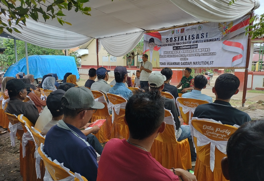 Pringsewu – Anggota DPRD Provinsi Lampung, Tondi Muammar Gaddafi Nasution, menegaskan bahwa Pancasila tidak boleh berhenti sebagai slogan atau hafalan semata, melainkan harus benar-benar hidup dan terwujud dalam perilaku masyarakat sehari-hari. Penegasan itu disampaikan saat ia menggelar Sosialisasi Pembinaan Ideologi Pancasila dan Wawasan Kebangsaan di Pekon Gadingrejo, Kecamatan Gadingrejo, Kabupaten Pringsewu, Minggu (8/2/2026).