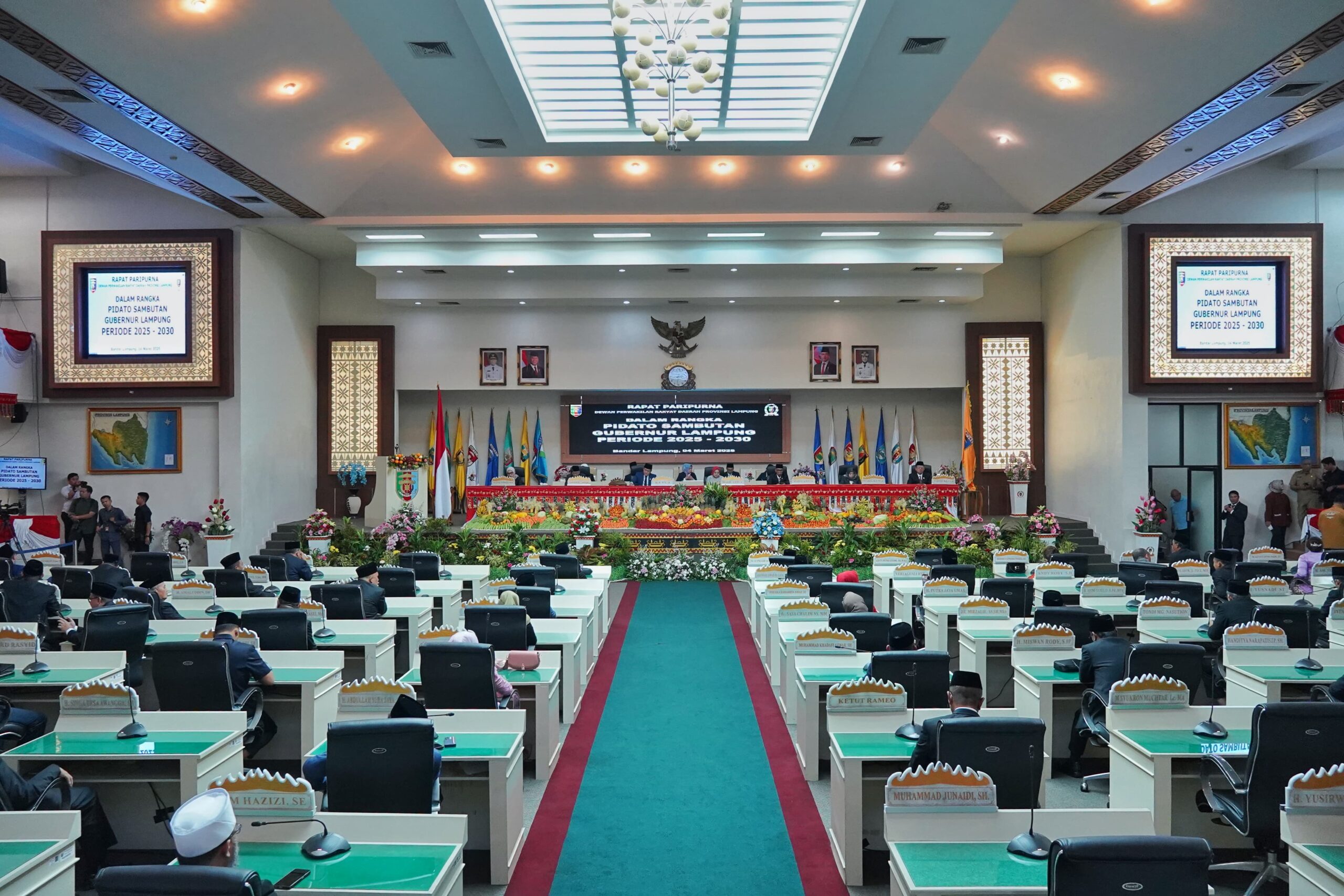 Bandar Lampung – Gubernur Lampung, Rahmat Mirzani Djausal, didampingi Wakil Gubernur Jihan Nurlela menyampaikan pidato perdananya dalam Rapat Paripurna Istimewa DPRD Provinsi Lampung, Selasa (4/3/2025).