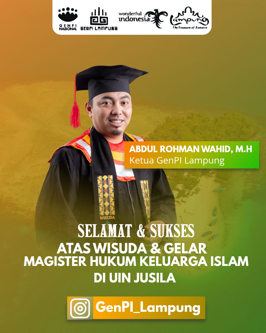 Di antara ratusan wisudawan, salah satu sosok yang menjadi sorotan adalah Abdul Rohman Wahid, tokoh muda multitalenta yang dikenal sebagai Ketua Generasi Pesona Indonesia (GenPI) Lampung, penggerak ekosistem ekonomi kreatif Payungi, pendamping sosial Program Keluarga Harapan (PKH), sekaligus Direktur Utama Media Online Madaninews.com.